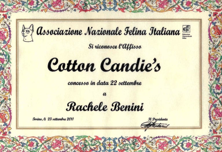 Nel 2011 è stato ufficialmente registrato l’affisso Cotton Candie’s presso ANFI (Associazione Nazionale Felina Italiana), segnando l’inizio di un progetto costruito con serietà, amore e rispetto per la razza.